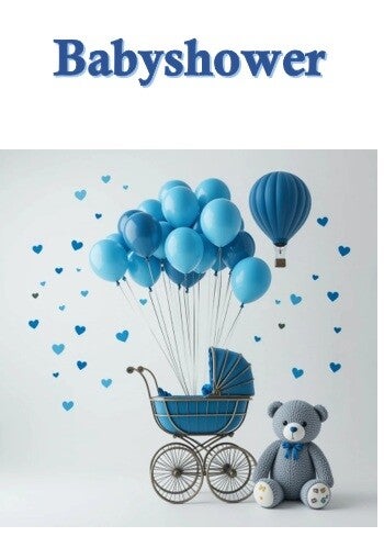 Et sødt og feminint babyshower-kort i f.eks. lyserøde eller blå og brune farver. Motivet viser en klassisk barnevogn, hjerteformede/normale balloner og en lille bamse, omgivet af små hjerter. Stemningen er blid, varm og perfekt til at fejre en kommende baby 💗