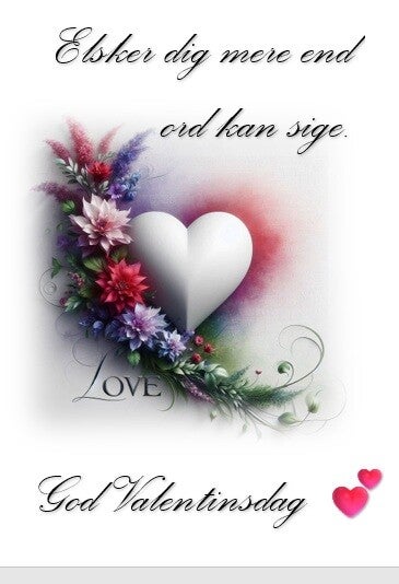 Et romantisk og følelsesfuldt valentinskort med et blødt og kunstnerisk udtryk. Motivet viser et hvidt hjerte omgivet af farverige blomster og fine ranker, der symboliserer kærlighed og nærhed. Teksten udtrykker dyb hengivenhed og afsluttes med en kærlig hilsen til Valentinsdag – perfekt til at sige jeg elsker dig ❤️🌸