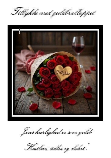 Kortet har et romantisk og eksklusivt udtryk. I centrum ses en buket dybrøde roser indpakket i papir, hvor et gyldent hjerte med teksten “Tillykke” er placeret blandt blomsterne. Motivet ligger på et rustikt træbord, med spredte rosenblade og et glas rødvin i baggrunden, som skaber en stemningsfuld og intim atmosfære. Øverst står teksten “Tillykke med guldbrylluppet”, og nederst afsluttes kortet med ordene “Jeres kærlighed er som guld – Klokker tiden og skinner.”